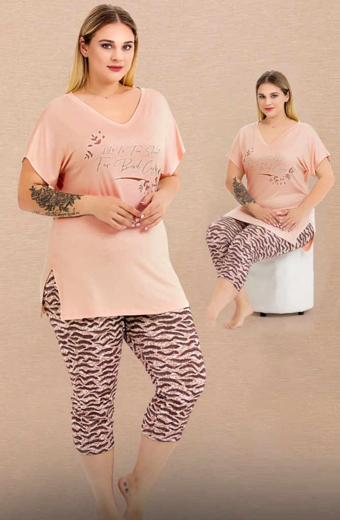 • Büyük Beden Zebra Desenli V Yaka Kısa Kollu Kapri Pijama Takımı
