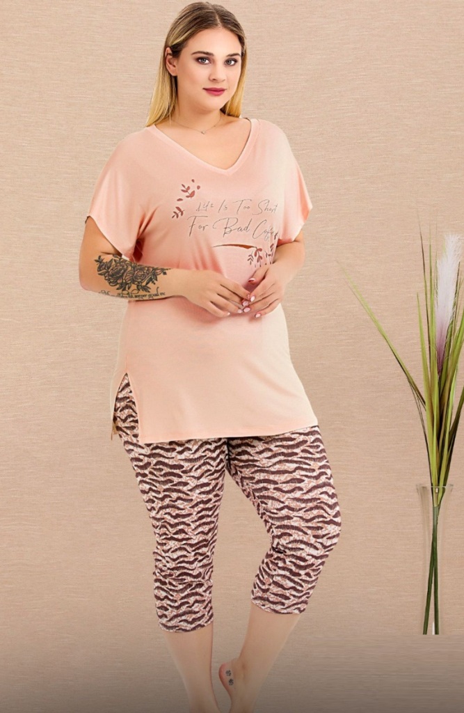 Büyük Beden Zebra Desenli V Yaka Kısa Kollu Kapri Pijama Takımı