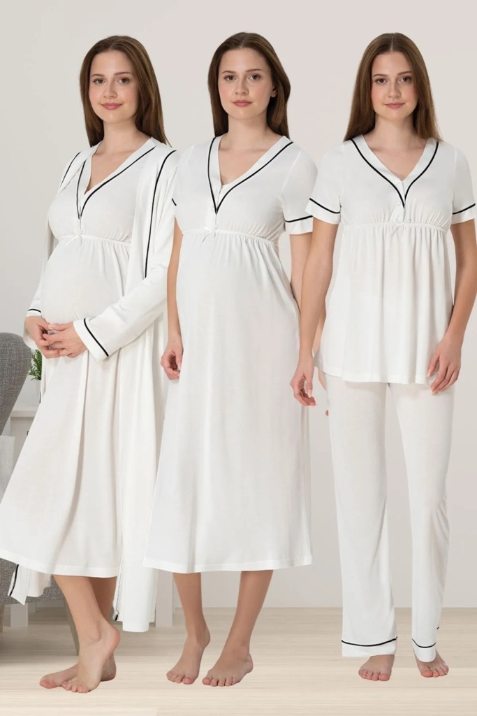 Ekru Sabahlıklı Hamile Lohusa Pijama Gecelik Takım 4 Lü Lohusa Seti