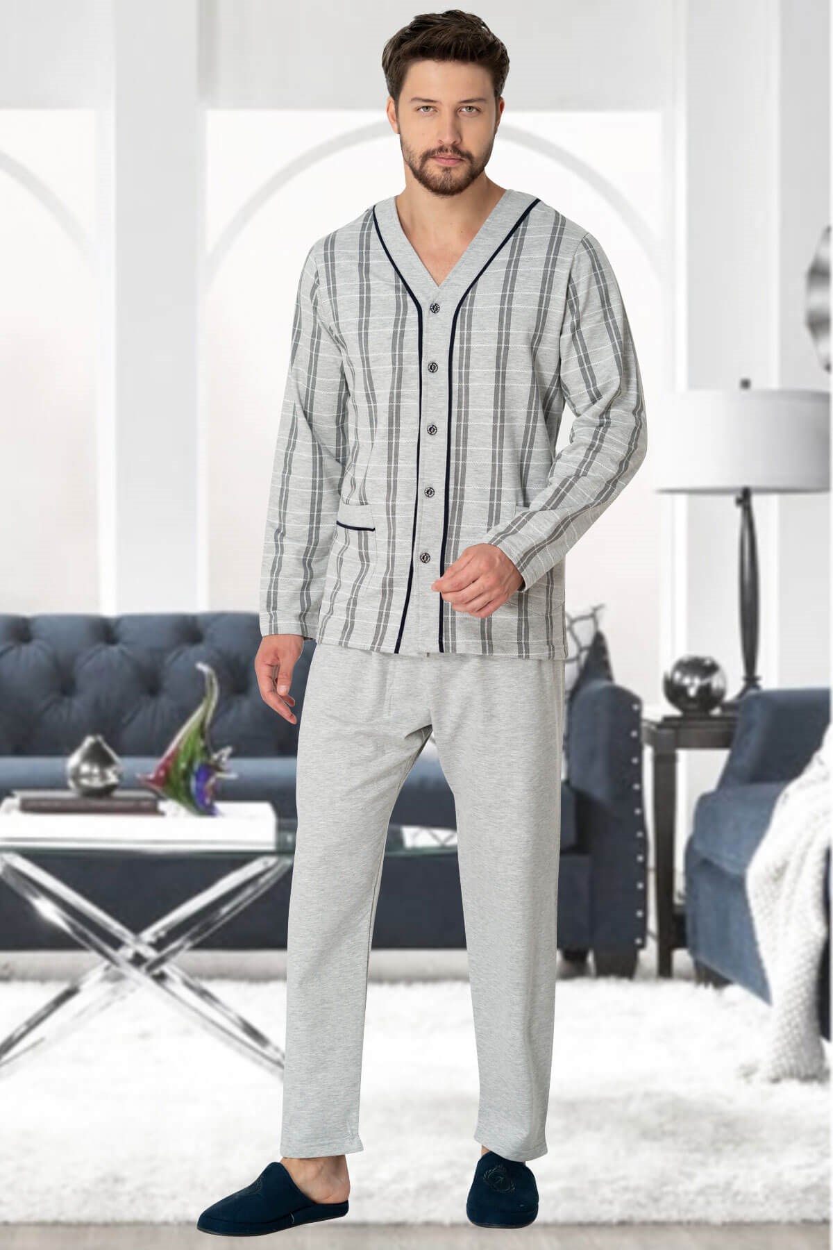 Gri büyük beden önden düğmeli erkek pijama takım kaliteli, esnek ve yumuşak kumaş yapısıyla size rahat kullanım sunar. Sağlığa zararlı hiç bir madde içermez. Erkek pijama takımımızın L-XL-2XL-3XL-4XL-5XL bedenleri de mevcuttur.