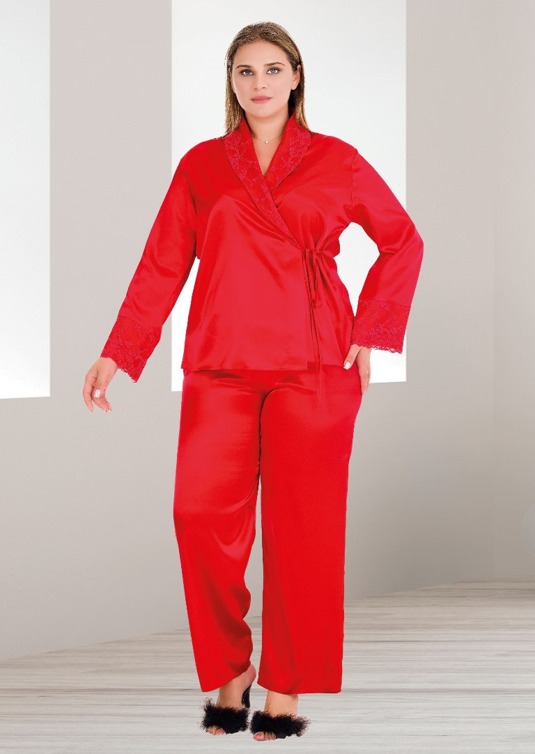 Kırmızı Saten Kruvaze Büyük Beden Uzun Kollu Pijama Takımı