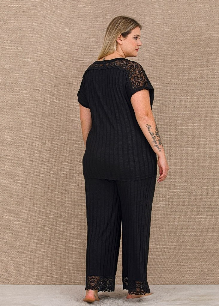 • Siyah Dantelli Kısa Kollu Bol Paça Büyük Beden Kadın Pijama Takımı