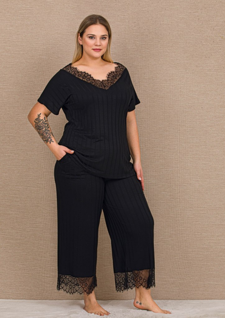 Siyah Dantelli V Yaka Kısa Kollu Bol Paça Büyük Beden Kadın Pijama Takımı