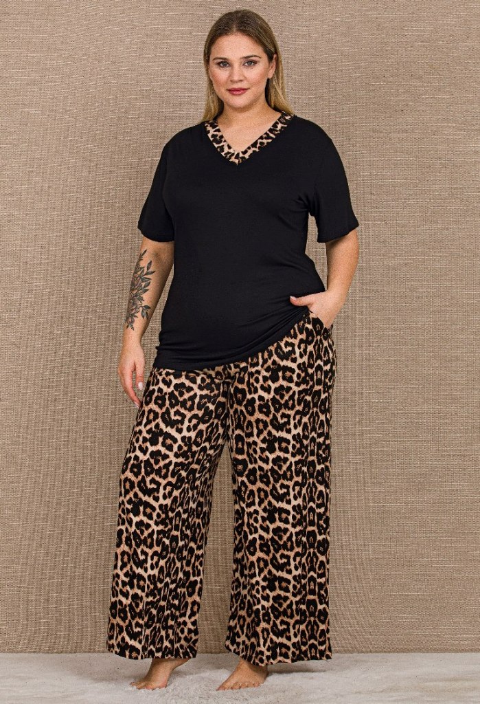 Leopar Desenli V Yaka Kısa Kollu Büyük Beden Pijama Takımı