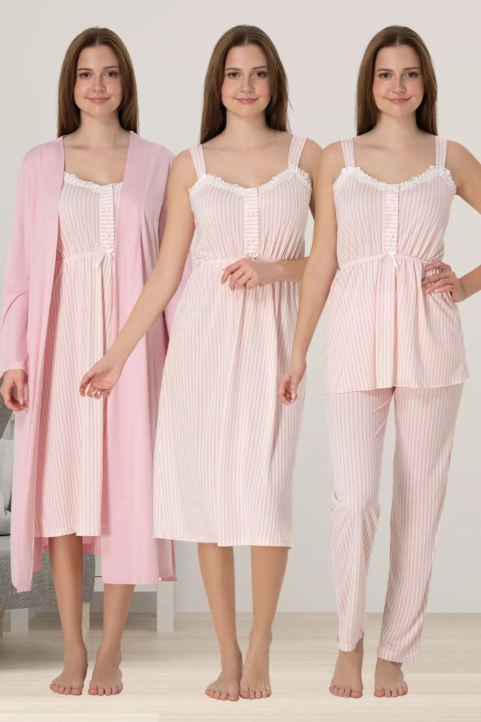 Pembe Çizgili Hamile Lohusa Sabahlıklı Gecelik ve Pijama Takımı