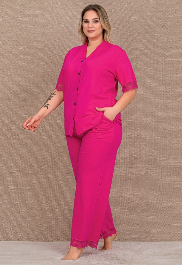 • Pembe Pamuklu Büyük Beden Önden Düğmeli Bol Paça Pijama Takımı