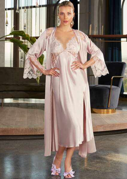 Pudra Pembe Saten Dantelli Gecelik ve Sabahlık Takım