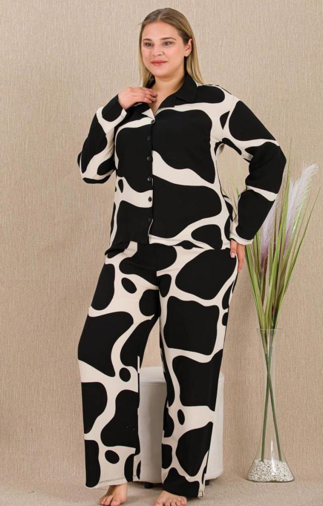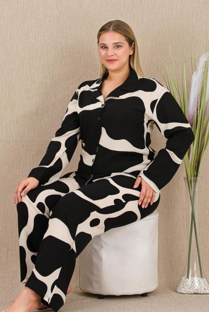 • Siyah Beyaz Dokuma Kumaş Önden Düğmeli Büyük Beden Pijama Takımı