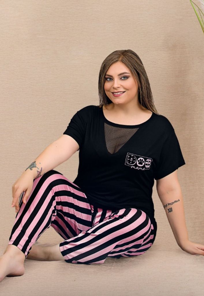 • Siyah Büyük Beden Çizgili Kısa Kollu Kapri Pijama Takımı