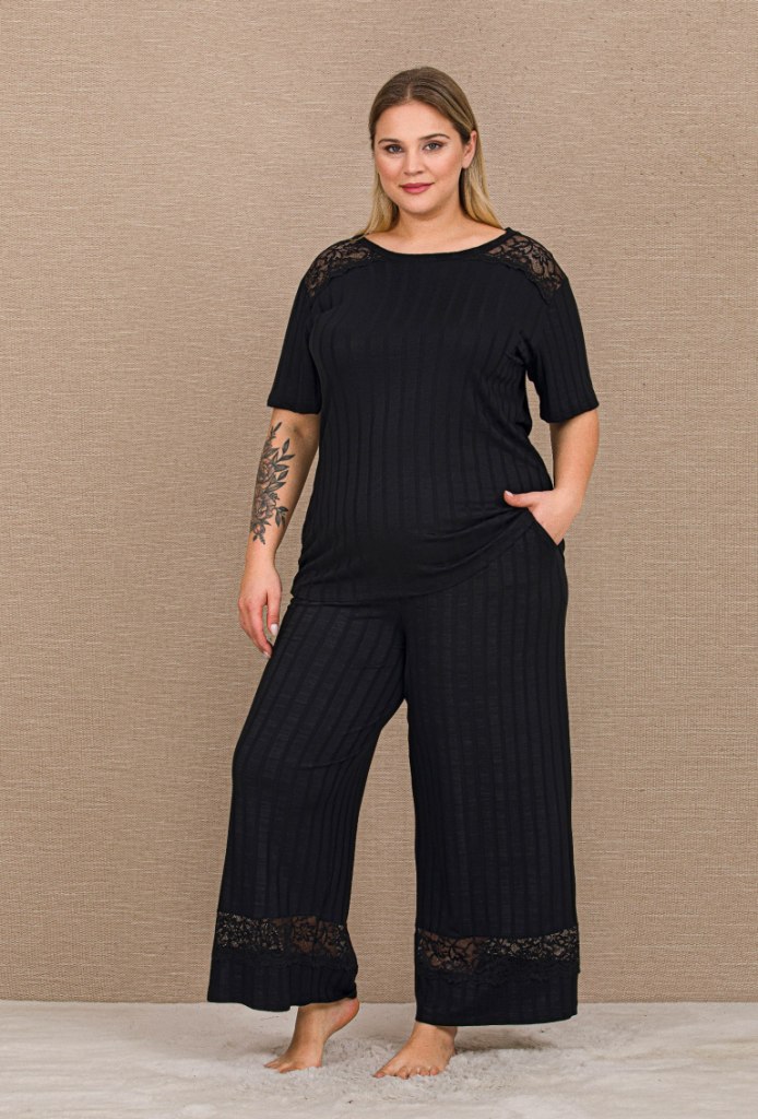 • Siyah Dantelli Kısa Kollu Bol Paça Büyük Beden Kadın Pijama Takımı