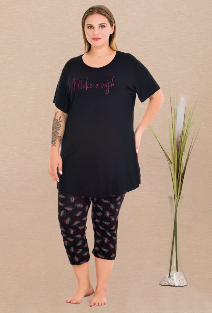 Siyah Desenli Büyük Beden Kısa Kollu Kapri Pijama Takımı