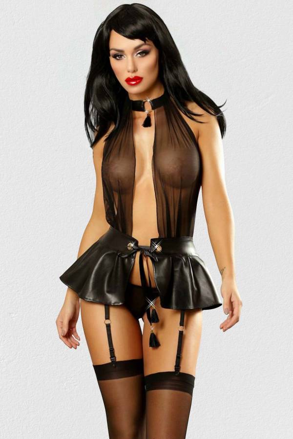 Siyah Lame Deri Görünümlü Tüllü Jartiyer Takımı
