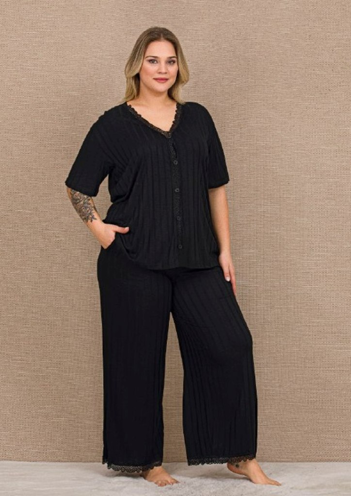 • Siyah Önden Düğmeli Kısa Kollu Bol Paça Büyük Beden Kadın Pijama Takımı