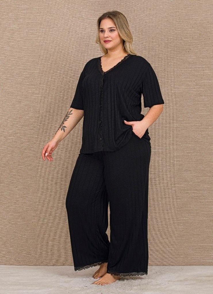 Siyah Önden Düğmeli Kısa Kollu Bol Paça Büyük Beden Kadın Pijama Takımı